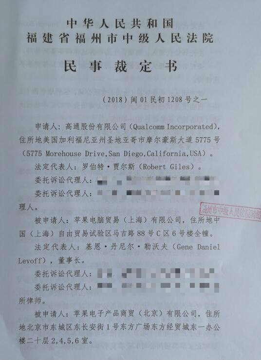 报导,福州中级人民法院的民事裁决书显现,高通申述的苹果四家子公司分别为苹果电脑交易(上海)有限公司、苹果电子产品商贸(北京)有限公司、苹果交易(上海)有限公司以及苹果电子产品商贸(北京)有限公司福州泰禾分公司。报导指出,高通公司声明裁决书不适用苹果公司托付台湾厂商和硕联合科技股份有限公司制作的产品,也就是说,被禁售的苹果产品不包含和硕出产的 iPhone。