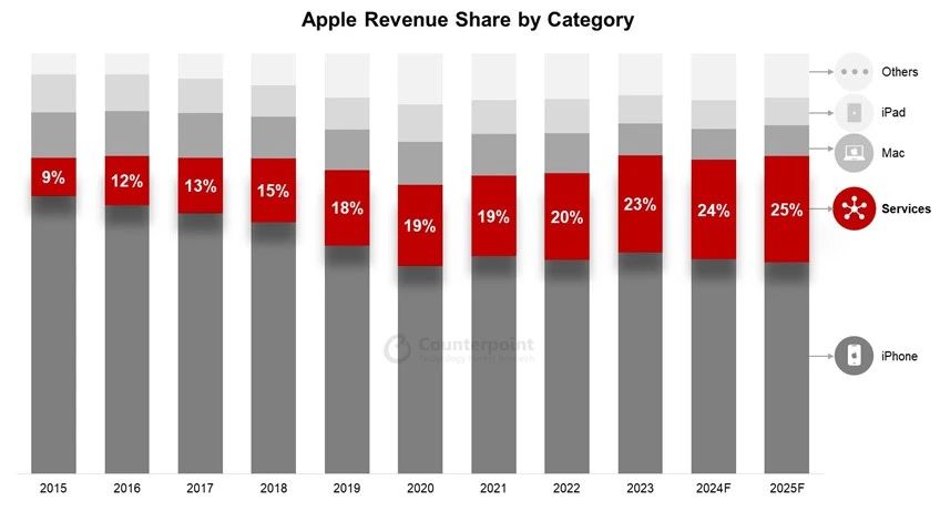 依据 Counterpoint Research 的 Apple 360 服务发布的陈述,苹果的服务部门在 2025 年或许占到公司总收入的四分之一。2025 年也将是服务收入初次打破每年 1000 亿美元大关的一年。此外,因为硬件和服务部门的增加,该公司估计将在 2024 年初次打破 4000 亿美元的收入大关。